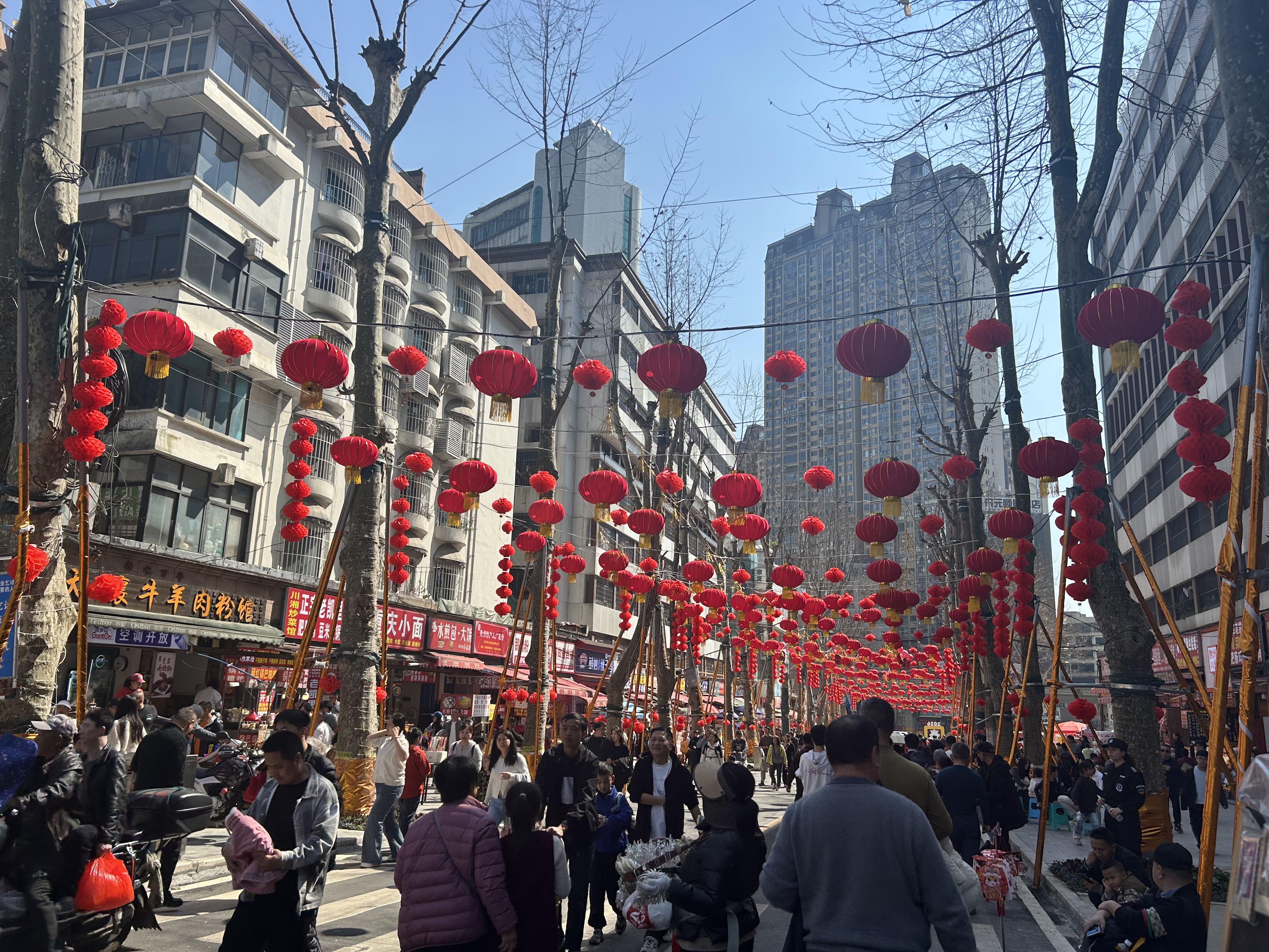贵阳网·贵阳新闻讯春节假期首日,贵阳天气晴朗,黔灵山公园附近处处洋溢着节日的氛围,吸引不少市民前来打卡,门口黔灵巷的菜市场内人头攒动,挤满了买年货的市民,年味十足。